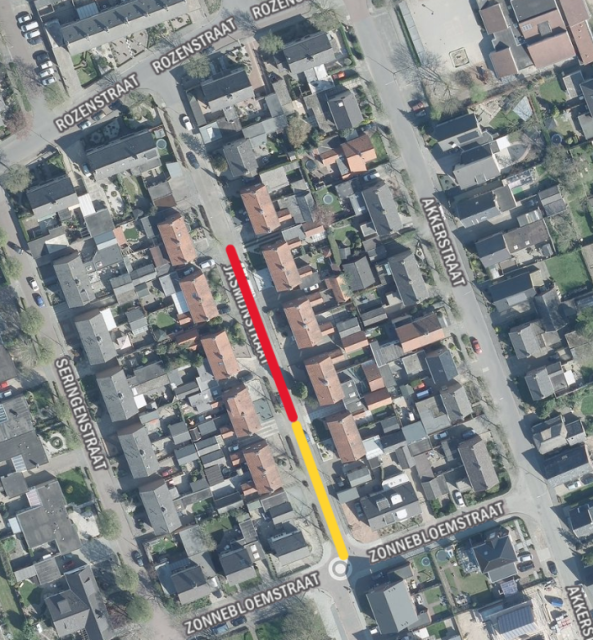 - afsluiting voor doorgaand verkeer hele Jasmijnstraat