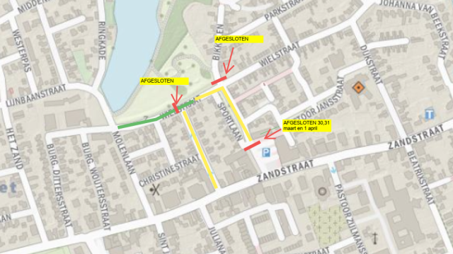 - tussen kruising Wielstraat met Molenlaan richting Sportlaan in gedeelten afgesloten voor verkeer en de Margrietstraat en deel Sportlaan